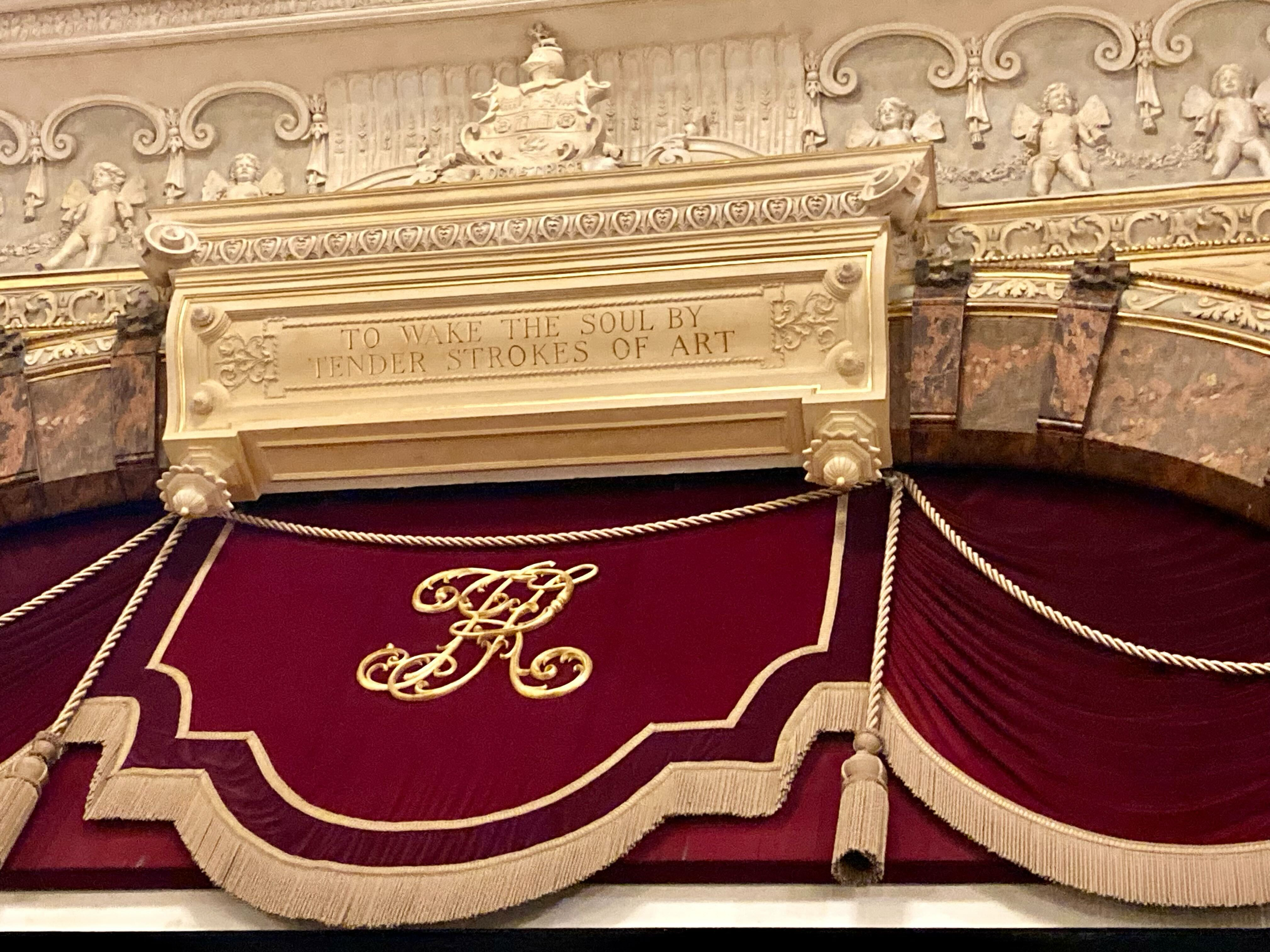 In the foyer, we see a plaque celebrating actor Edmund Keen who died in Richmond in 1833, and one to Fredrick Piffard who ran the theatre from January 1947 until 1973 and presented over 1,000 plays, music hall, ballet, and twenty-five pantomimes. The foyer ceiling was painted by Lawrence Llewellyn-Bowen in the 1989 refurbishment, it shows two nymphs, supported by cherubs bearing the masks of Comedy and Tragedy, bring a memorial tablet of Frank Matcham.