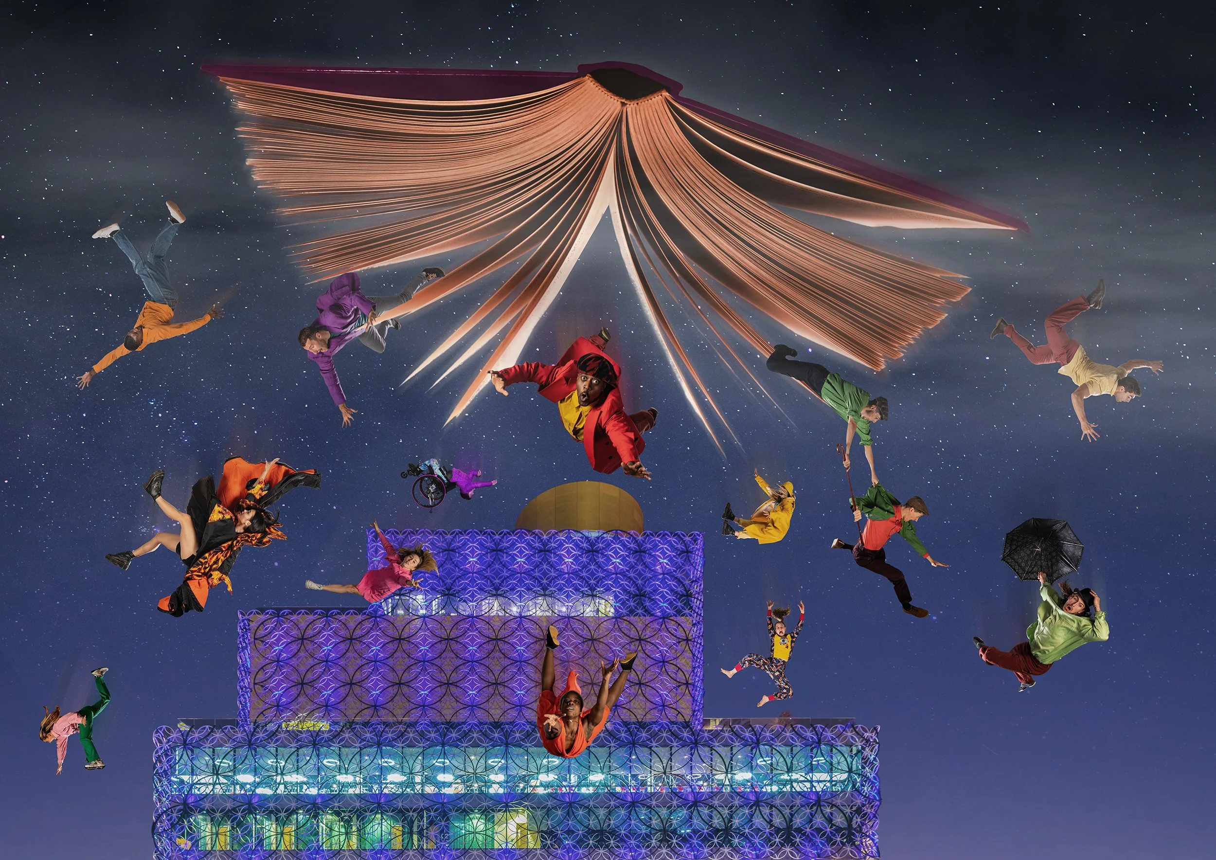 New imagery released today gives a hint at the spectacle that will await audiences as aerialists and dancers take to the skies above the public square and giant set pieces, such as a flying book, hover over the skyline.