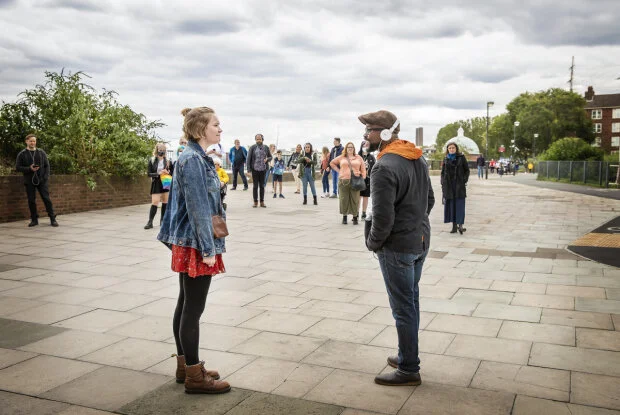 Taking place in Salford Quays and central Manchester, audience members wear headphones, which feed them the story, and follow cast members across city spaces.