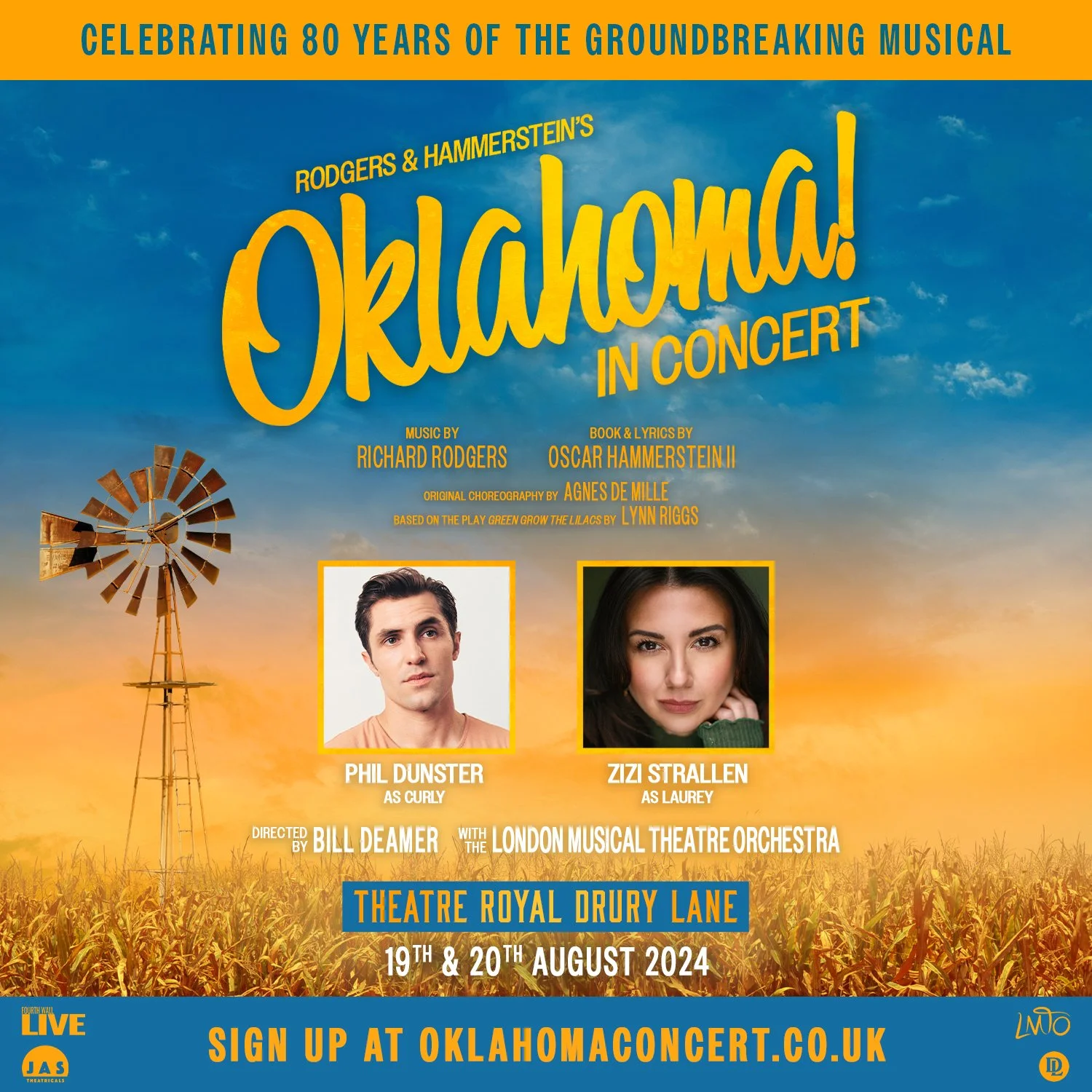 In celebration of its 80th anniversary, RODGERS & HAMMERSTEIN’S OKLAHOMA! returns to its original West End home, Theatre Royal Drury Lane, in concert on Monday 19 August and Tuesday 20 August. RODGERS & HAMMERSTEIN’S OKLAHOMA! in Concert stars Emmy, Critics Choice & Olivier Award-nominated actor Phil Dunster (Ted Lasso) as Curly alongside West End star Zizi Strallen (Mary Poppins) as Laurey.