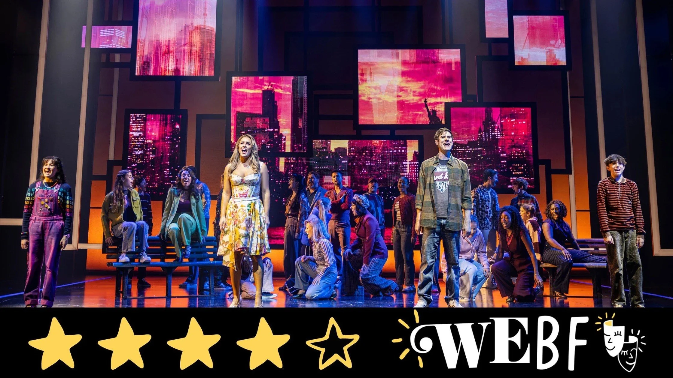 Colin Richmond’s set depicts the different locations just fine enough, but on the whole, feels quite limited and low budget. George Reeve’s video design works well within the set design, but perhaps it would have been better just to have a video backdrop rather than a series of interlocking picture frames that occasionally move. Gabriela Tylesova’s costumes, however, are fabulously vibrant, particularly the costumes for the kids and Jenna. In Jenna’s costumes, she perfectly captures how a 13 year old might want to dress if she suddenly woke up and found she was 30. Howard Hudson’s lighting design adds loads more colour to the stage, elevating the limited set piece, and Adam Fisher’s sound design ensures we hear almost every word and that the sound from the talented company and band, under the direction of Amy Shackcloth, fill the auditorium.