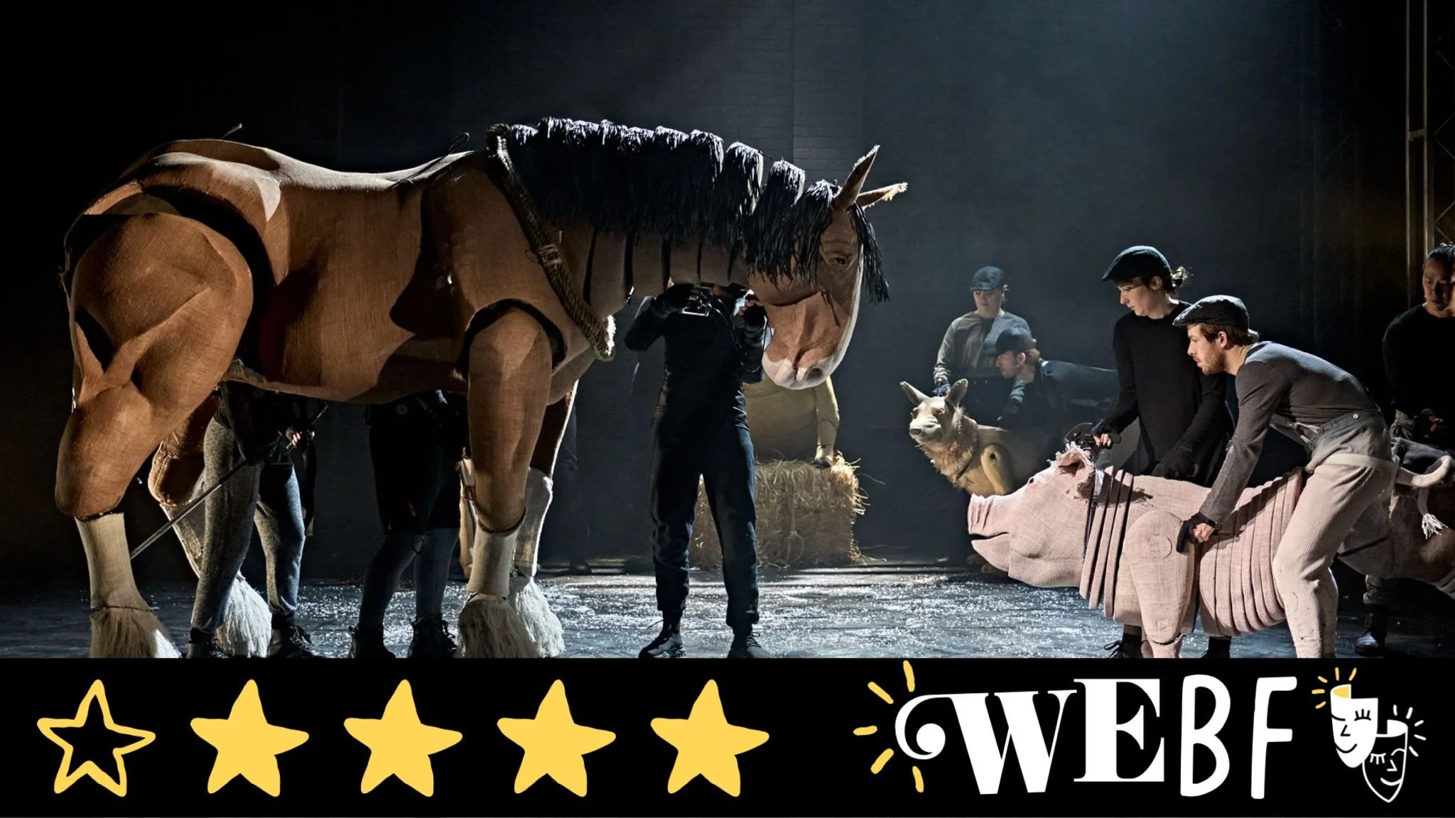 The puppetry of the many animals on stage is nothing short of spellbinding. You really do feel that the animals have a reality and do not notice the cast after a time. The movement around the stage by the cast is athletic, true to the animals they are portraying, and they also provide the many sounds of the farmyard perfectly. The puppets themselves, designed by Toby Olié, are very much life sized; whether a small pigeon, or a gigantic shire horse, they are mesmerising throughout. There are some fantastic slow-motion fights amongst the human farmers and animals which, when combined with the dramatic music of Tom Gibbons and lighting of Jon Clark, really make you feel you are in the moment.