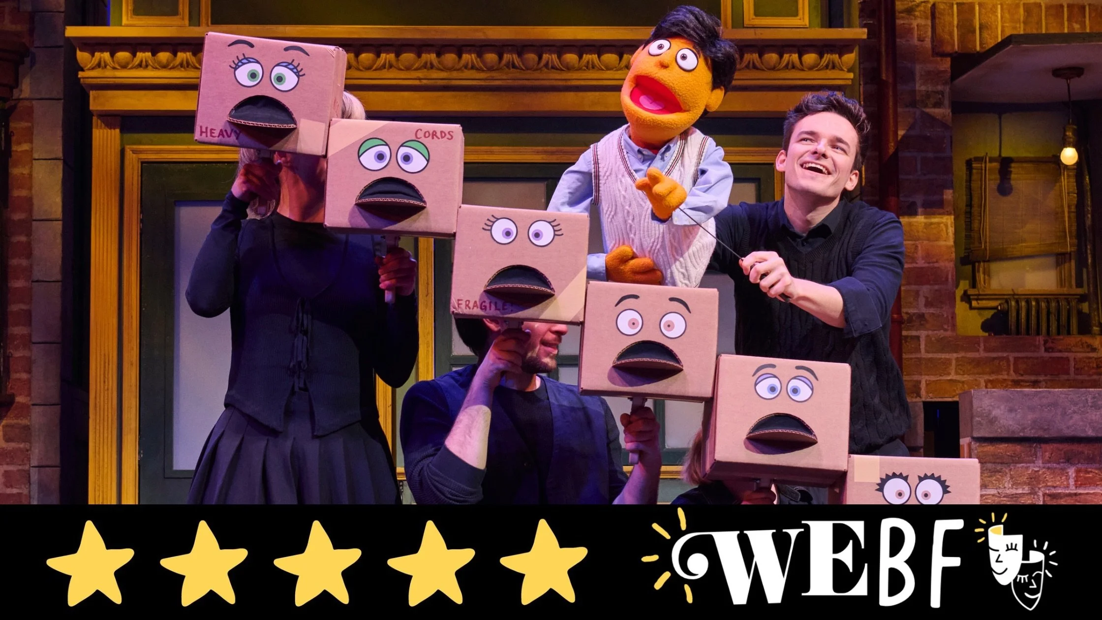 Director Jason Moore ensures the production moves along at a great pace. He leads his cast in developing characters and relationships that are believable in this slightly surreal world. Anna Louizos’ set is effective, creating a multitude of locations with different opening doors and windows. The visuals are elevated by Nina Dunn’s video design, whilst the show never relies on the projections. Rick Lyon’s puppets really look the part – kids’ TV show puppets but grown up. Jean Chan’s costumes also fit this world perfectly.