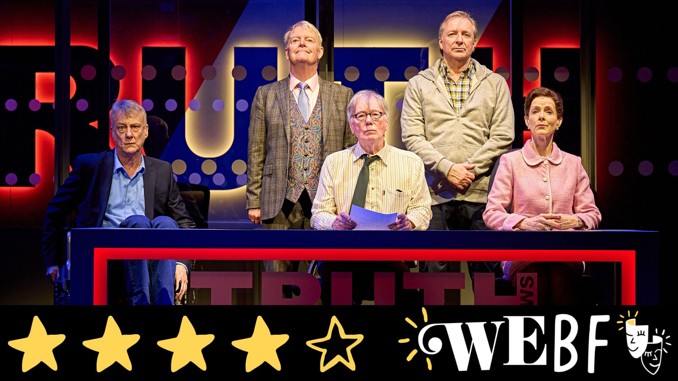 The wonderful first Act which seemed sharp and topical does tail off as fast as the Truth ratings fall in Act 2. There is a topical gag about the infected blood scandal, but the writers main focus is to tie up the relationships and have a rant about the state of British News reporting as they note “viewers don’t believe the news is true anymore”, which the New Victoria audience almost certainly already agreed with.