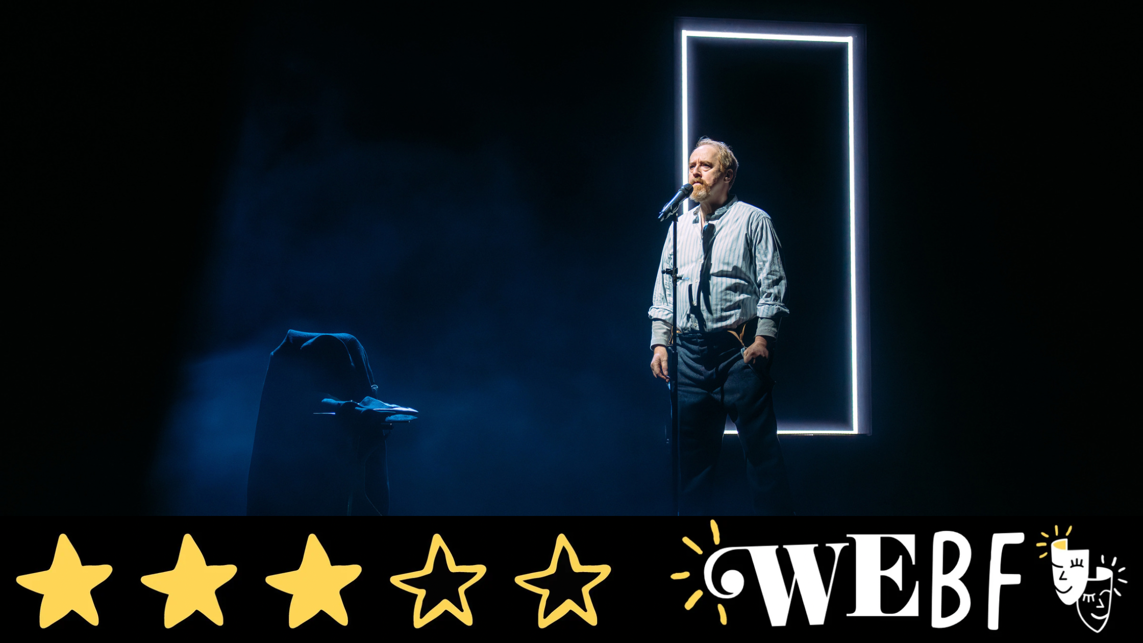 It is a story that starts with a door, and the use of lighting – designed by Richard Howell – is wonderfully simplistic, yet assured. The appearance of the door, and then the strobing warp as we step into the life of Utterson fully, back in autumn, is incredibly effective, as are the moments of darkness – that “primal dark” that Enfield tells us of, with just the accursed door floating somewhere just out of reach. The office location is created through the use of a small, focused light, within the greater frame of the stage, and the direction, by Michael Fentiman, is masterful in drawing our attention to just the right spot. The staging itself is equally simplistic – once Masson steps through from his initial direct address, the staging is composed solely of a chair and the microphone stand he began with upon this raised platform.