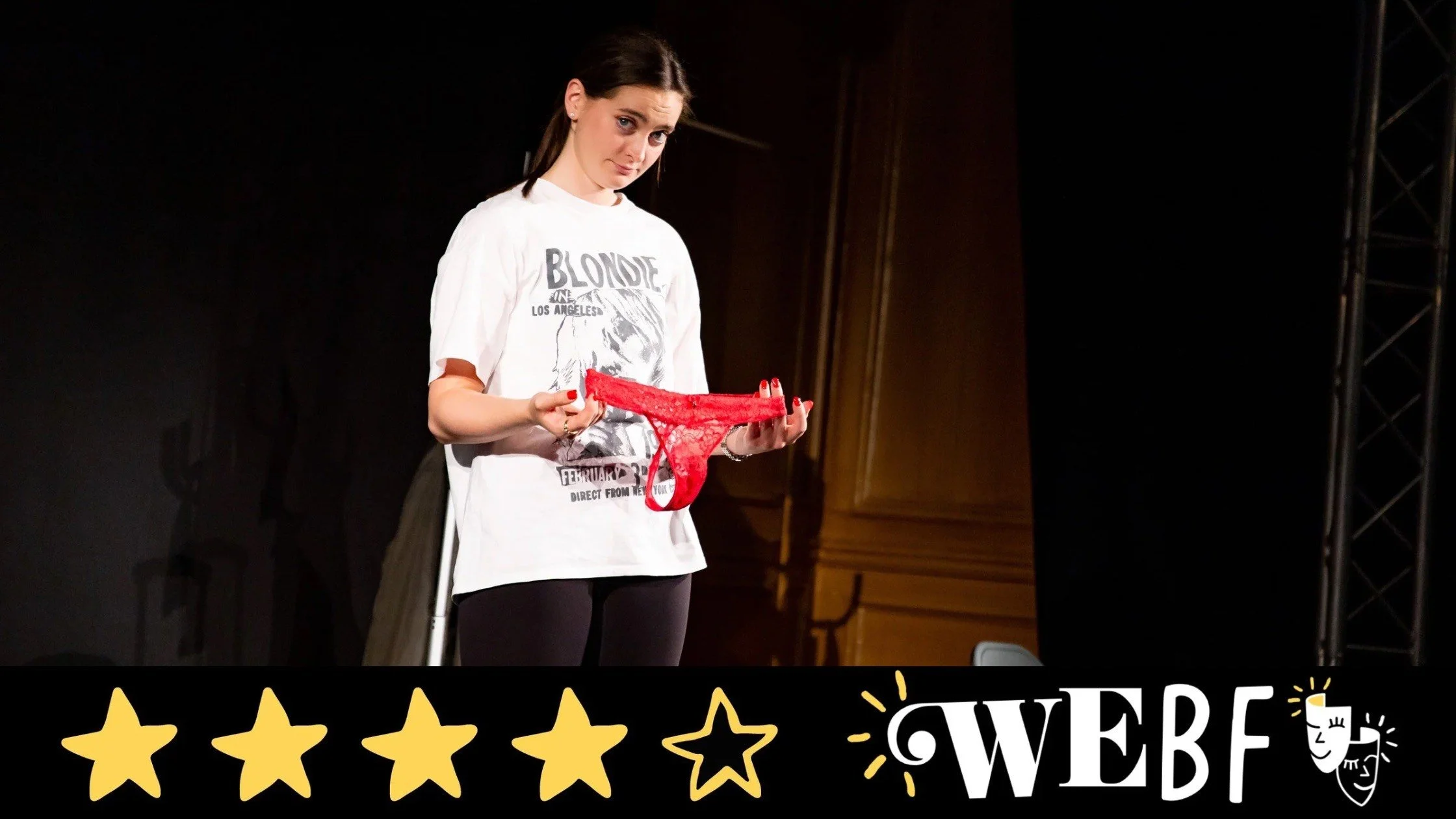 Cameron-West is not only a talented writer, she is a master at comedic acting. She bravely embraces the comedy, which at times must be quite embarrassing for her to perform considering that she dances around the stage in a lacy thong at one point. She embodies her character to the full and lets her character be at the mercy of the wrath of her emotions. Everything from her facial expressions to her body movements has been carefully considered but it looks effortless. Her comedic timing is spot on and has us in hysterics throughout the show, and her ability to perform one-sided conversations is an art. Cameron-West's acting prowess enables this one-woman show to be well paced and fluid, allowing us to sit back and bask in her ability to confidently take up the full stage space.