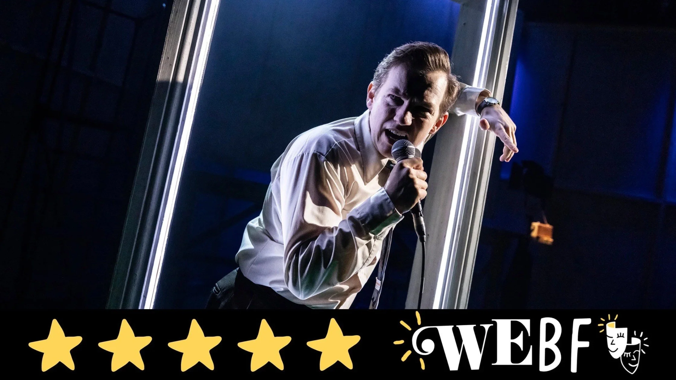 Joshua Pharo’s exceptional lighting and video design lifts the dramatics of a one-man show into something truly immersive, drawing focus to empty spaces, to microphones without speakers, to a single doorway leading to justice or to disaster. Giles Thomas’ sound design warps Holden’s single voice into a mob made up inexplicably of individuals, guiding the audience to each character and timeline through the crackling of radios, the tinniness of an interview tape, and the heart-stopping echoes of gunfire in the otherwise peaceful space of an ordinary town. Anisha Fields’s set needs little addition - barely changing throughout - it’s only a matter of performer interaction. Fields’ design facilitates cold courtrooms and tight, tense moments in intimate bars, and all Holden needs to do to switch between is swivel a doorway.