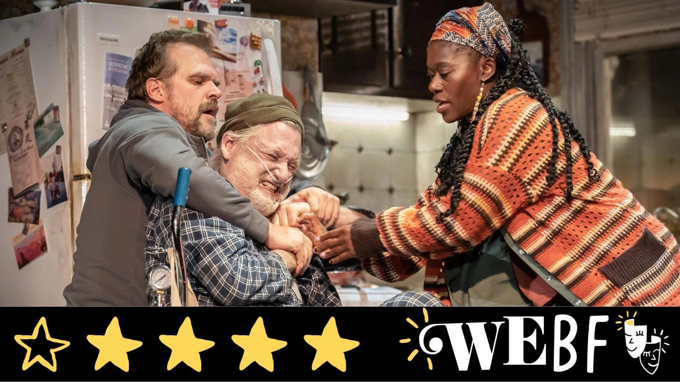 The show is led by Stranger Things David Harbour who plays the role of ex-mental patient and mother’s favourite, Michael. Harbour stomps around the stage like a modern day Lennie Small. His physical presence on stage isn’t the only impressive thing though. Whilst overtly emotional, there is a nuanced stroke to Harbour’s performance and you can’t help but feel for his character as the play progresses. A hard part to get right but Harbour absolutely nails it, and with perfect comedic timing.