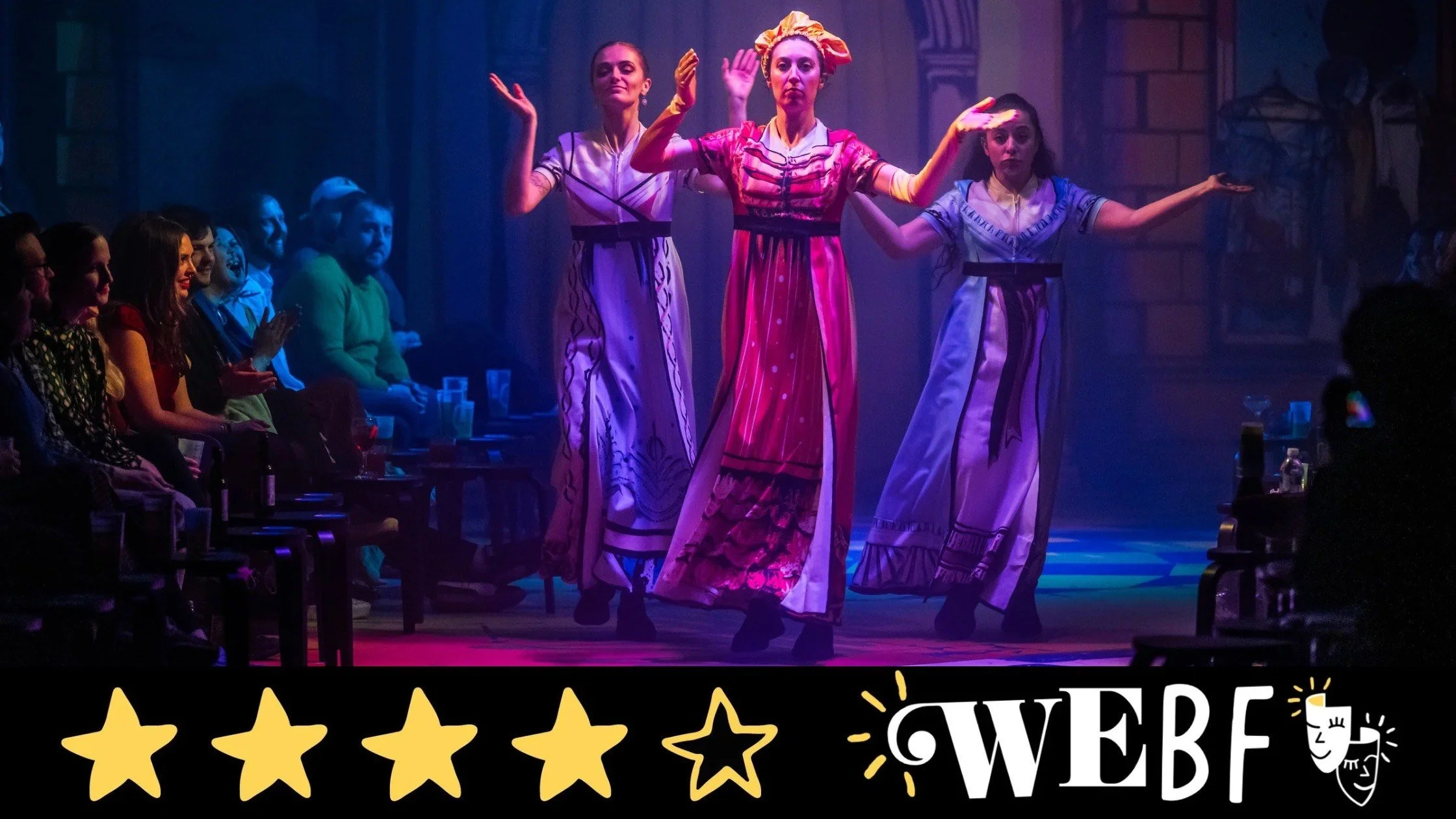 Plied and Prejudice pays homage to the original novel but also takes inspiration from previous adapations. The famous lake scene from the 1995 BBC TV series becomes the ‘Wettest of Wet T-shirt Contests’ and the classic Mr Darcy hand flex from the 2005 film has its moment. The role of Mr Collins is a real highlight and his truly replusive character is amplified for comedic effect. The layout of the venue means that there are a few moments we missed but this did nothing to dampen our enjoyment of this brilliantly entertaining show.
