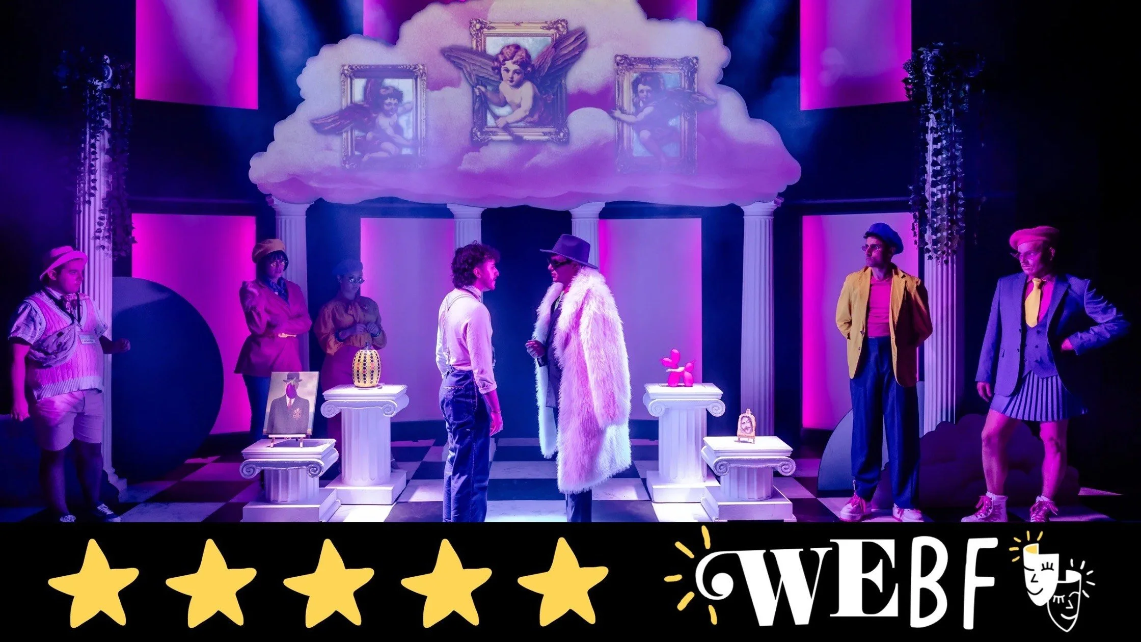 The new design really sets the tone for how incredibly camp the show is going to be, with its mix of modern pop and renaissance features. The set is simple but really effective, especially with its brightly coloured lighting, and doesn’t underestimate the intellect of the audience to understand what these pieces are supposed to be representing. We particularly like that a lot of the projections in the show are projected onto the cloud above the pillars at the back of the stage space, it definitely creates a feel of a time of higher art and revolutionary discovery. With its omnipresence above the stage, the cloud also gives a sense of reaching for something more intangible, like aspiring to/dreaming of a more understanding and accepting plane of being.