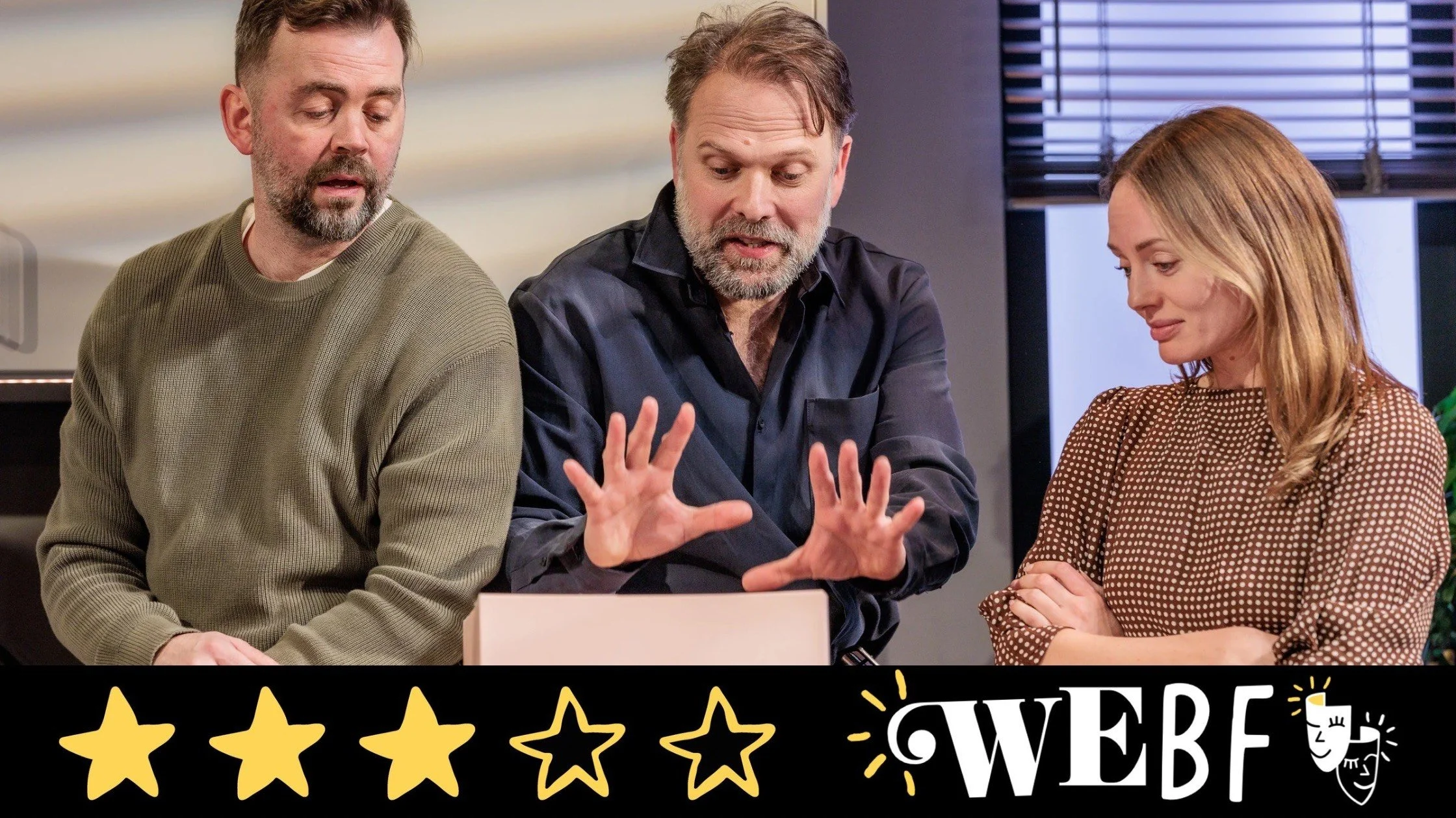 With the two male characters often getting over excited, it is a relief to have Haddock bring calm, sense and maturity to the role of Lisa. When Colin and Brian regress to acting like stroppy adolescents, it is a genuine joy to watch Haddock’s quiet look of bemusement revealing her lack of ever hoping to understand these men. Adam Meggido’s direction underpins these strong performances by never letting the action flag.