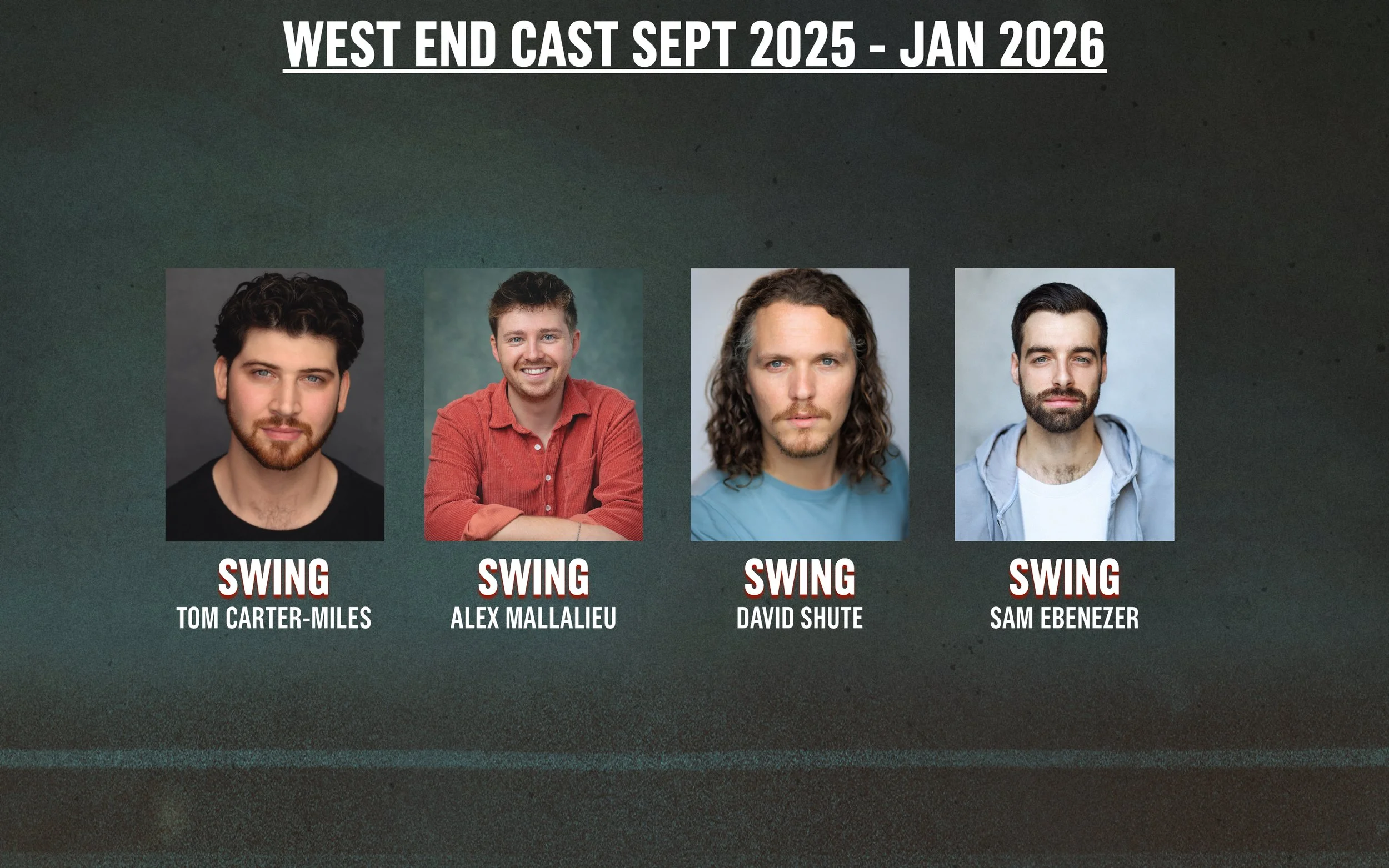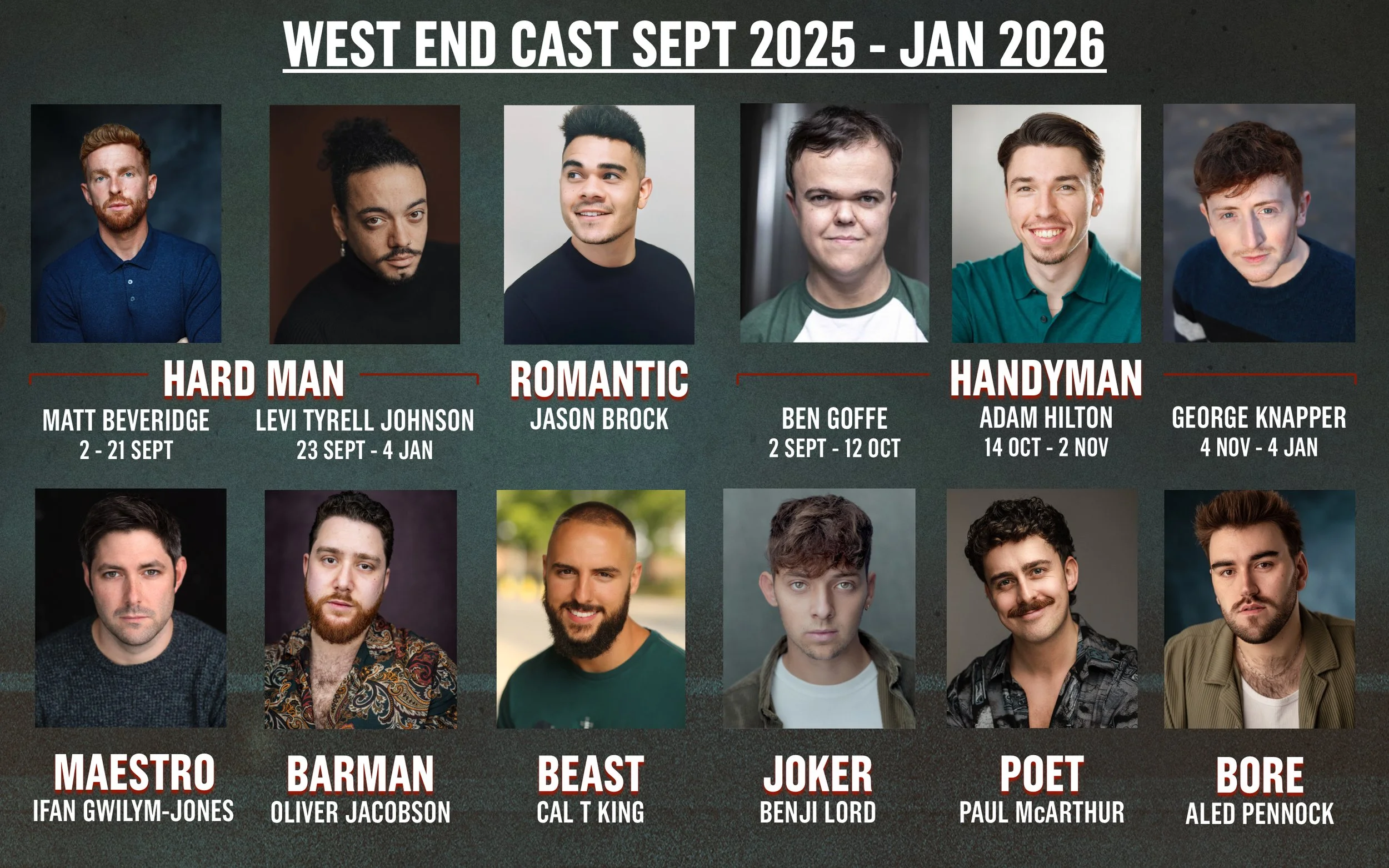 From 2 September, the full extension company include Aled Pennock as Bore, Jason Brock as Romantic, Cal T King as Beast, Ifan Gwilym-Jones as Maestro, Oliver Jacobson as Barman, Benji Lord as Joker, Paul McArthur as Poet, Tom Carter-Miles (Swing), Alex Mallalieu (Swing), Dave Shute (Swing), and Sam Ebenezer (Swing).